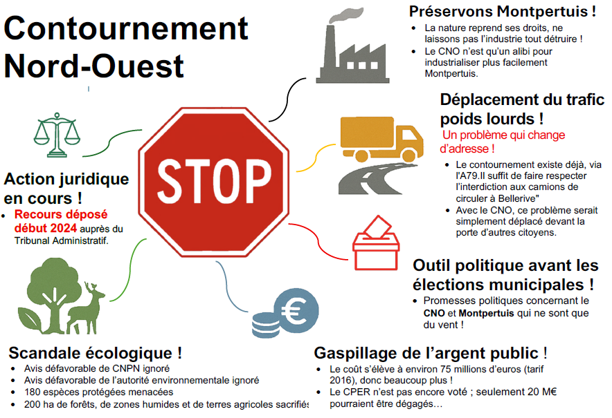 Paradoxalement, le « CNO » réclamé à grands cris par certains, existe déjà via l’A79 et la nouvelle RCEA qui a coûté 600M€. Le trafic de poids-lourds doit se déporter sur ce CNO déjà existant, et respecter l’interdiction de circuler dans l’agglomération.